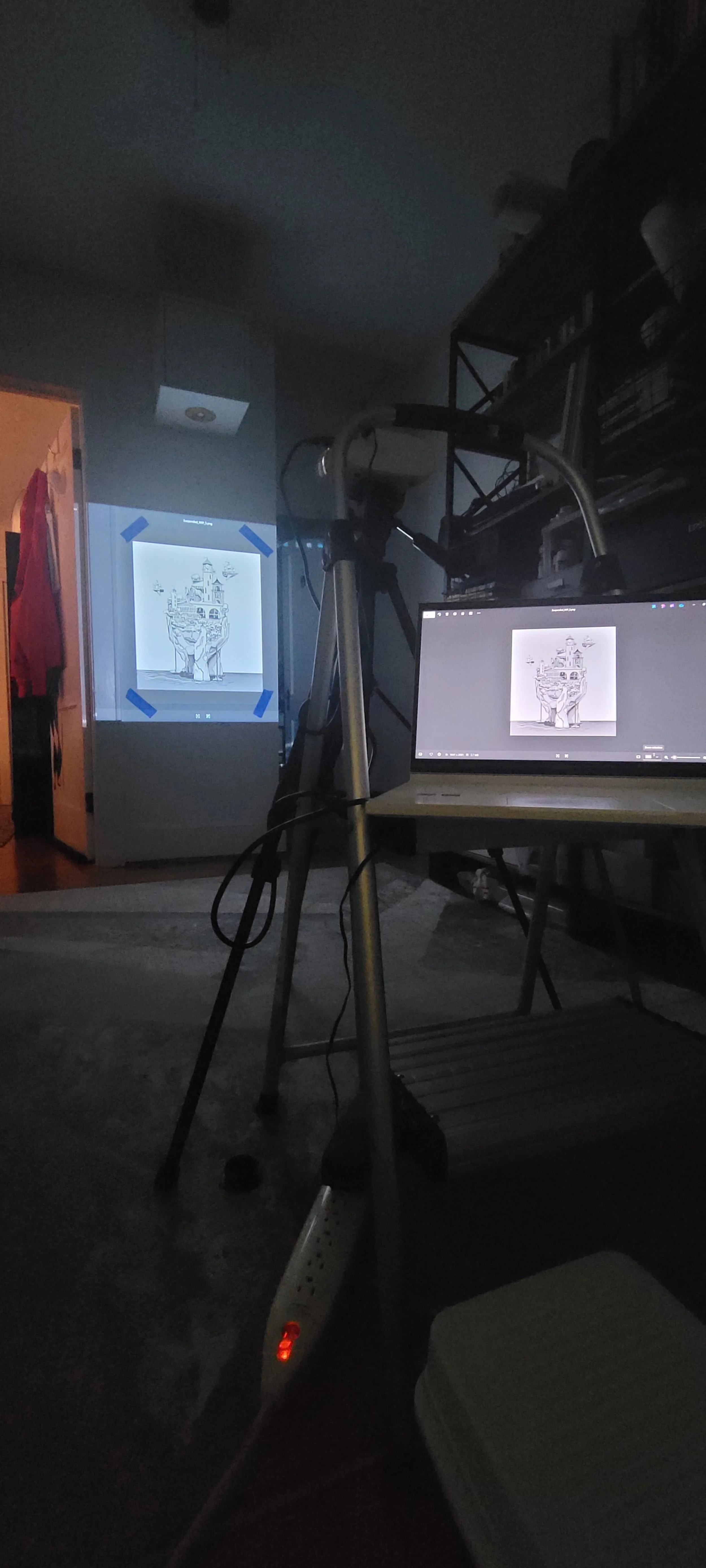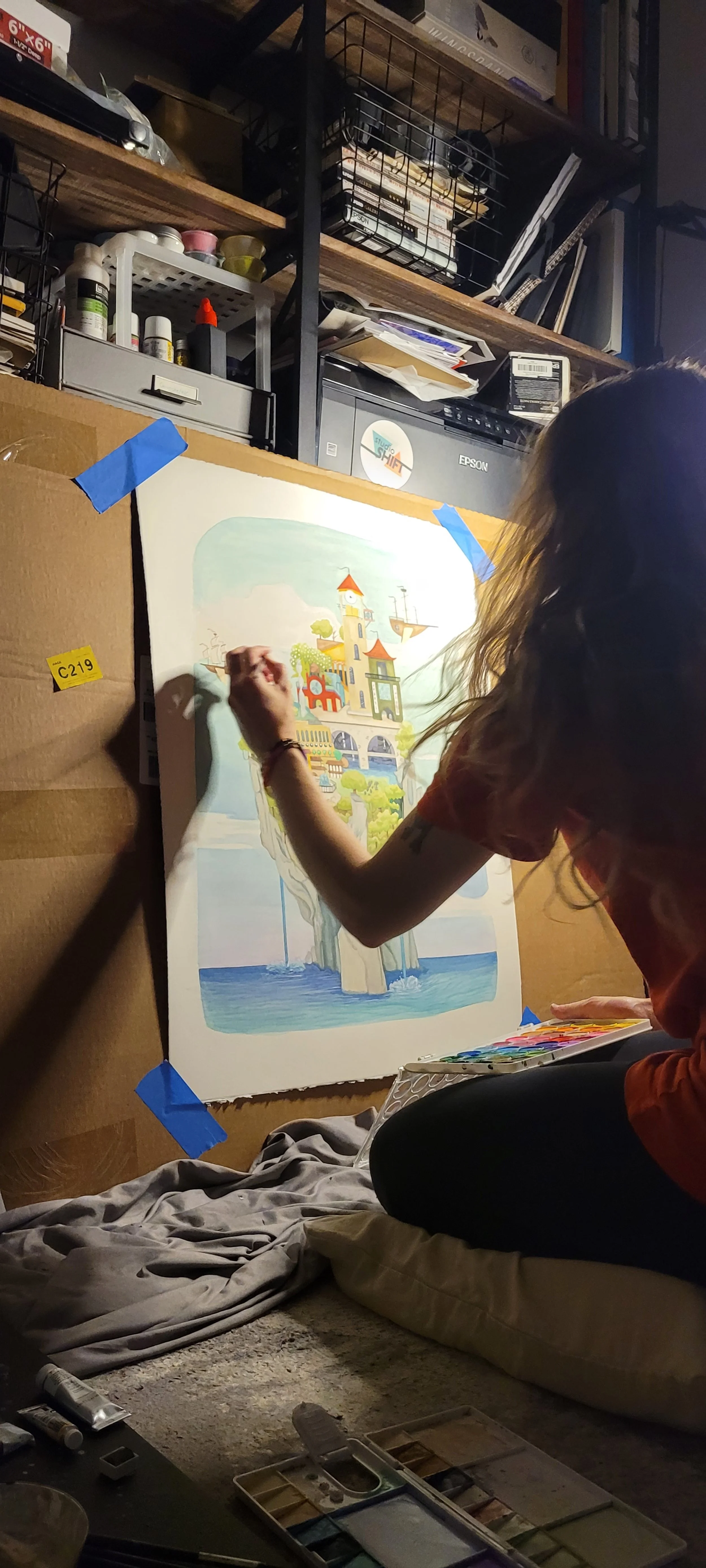 Isle of Dreams was created in conscious oscillation between traditional and digital techniques. First a hand drawn sketch, it was then scanned and drawn again digitally to procure separate layers for line and color. The line layer was projected and traced onto a large sheet of watercolor paper and the color layer was utilized as a palette reference.