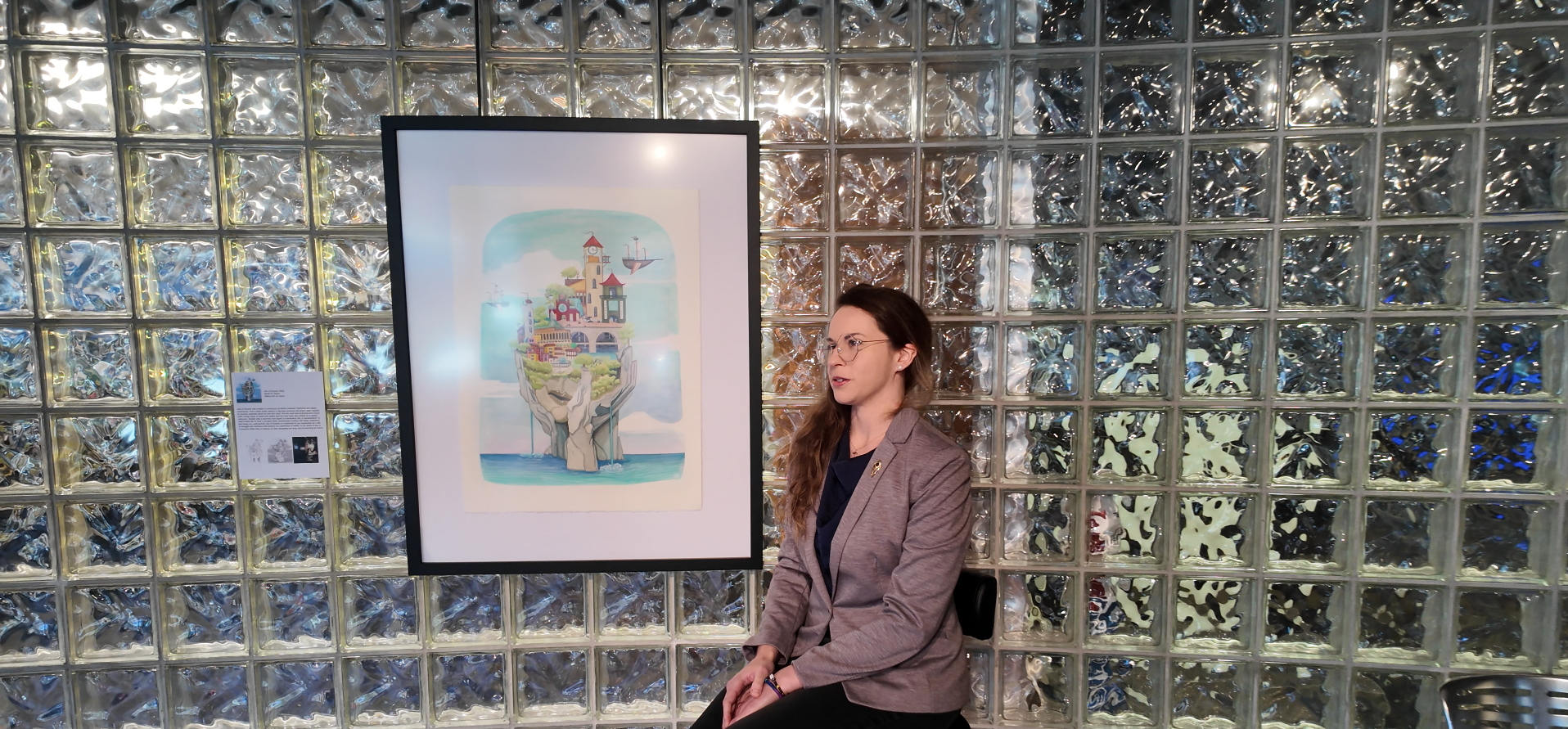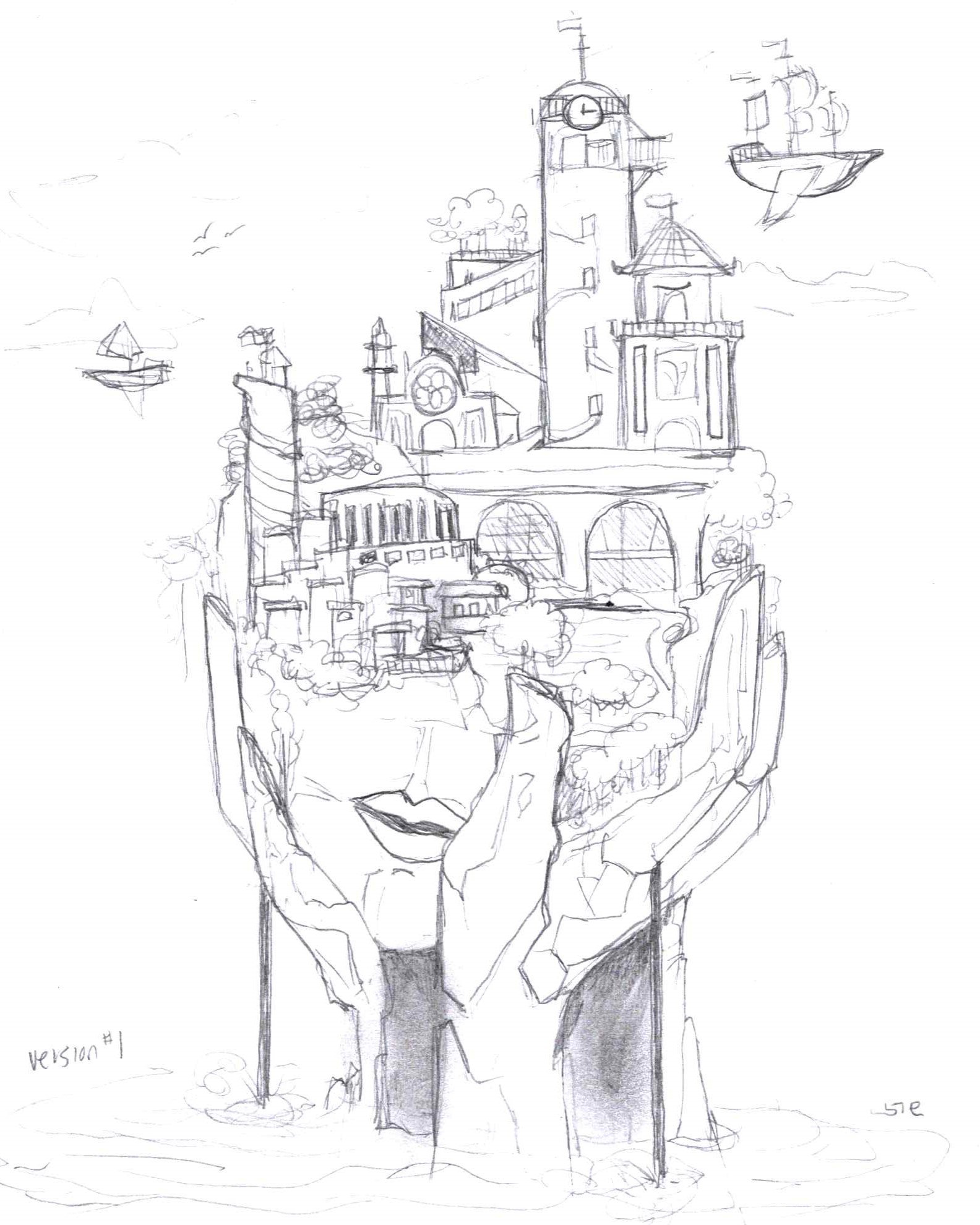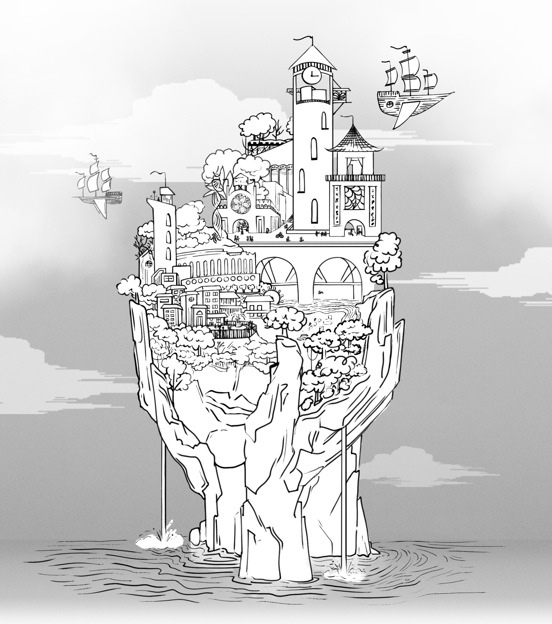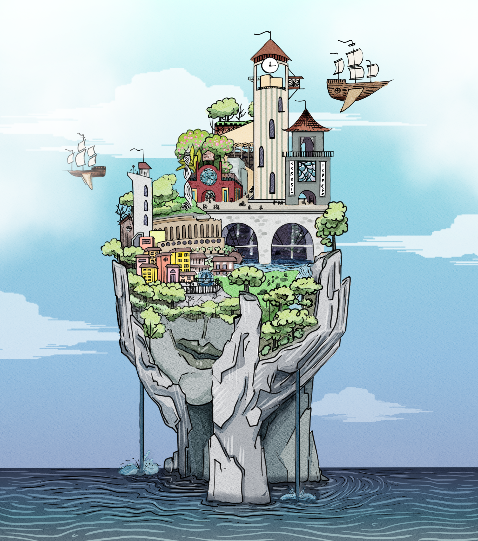 Seated atop a face-like rock figure is a fantastical city: a representation of what it feels like to have a creative mind, continuously bustling with ideas, solidifying this image as a self-portrait. Isle of Dreams is a testament to our imagination as a site of struggle and resilience that shapes our experience of reality. To be aware of this is a powerful initial step in helping us heal, navigating our lives, and envisioning our future.